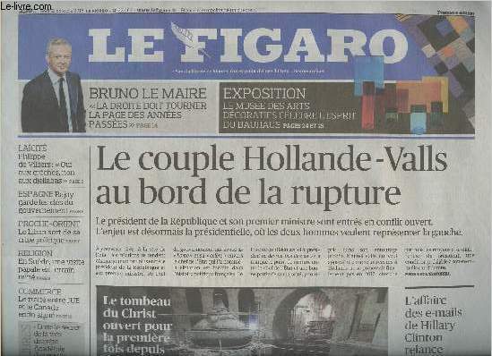 "Sommaire : Le couple Hollande-Valls au bord de la rupture - Le tombeau du Christ ouvert pour la première fois depuis deux siècles - L'affaire des e-mails de Hillary Clinton relance la campagne américaine - Bruno Le Maire : ""La droite doit tourner la page des années passées"" - Laïcité : Philippe de Villiers :""oui aux crèches, non aux djellabas"" - Espagne : Rajoy garde les clés du gouvernement - Proche-Orient : Le Liban sort de sa crise politique - Religion : En Suède, une visite papale en terrain miné - Commerce : le traité entre l'UE et le Canada enfin signé.. Classification Dewey : 70.1-Journaux"