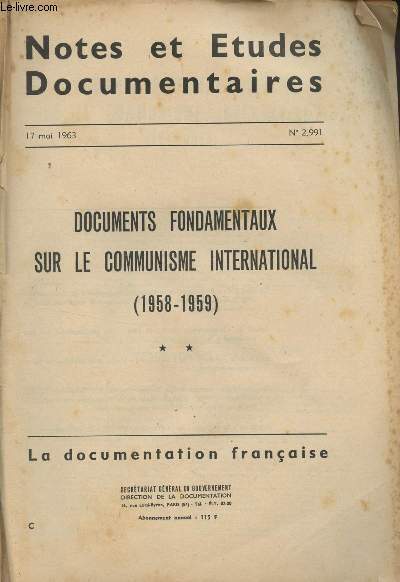 "Sommaire : Documents fondamentaux sur le communisme international (1958-1959) tome 2 - Chapitre II du ""programme de la ligue des communistes de Yougoslavie "" (VIIe congrès, 22-26 avril 1958) : ""la lutte pour le socialisme dans les conditions nouvelles"" - Articles du ""Jenminjipao"" du 5 mai 1958 : ""le révisionnisme doit être condamné"" - Article de la ""Pravda"" du 9 mai 1958 : ""l'unité et la cohésion des partis marxistes-léninistes"" - Chapitre IV du ""Rapport de N.S. Khrouchtchev au XXIs congrès du P.C.U.S. (27 janvier 1959) : ""nouvelle étape de l'édification du communisme et quelques questions de la théorie marxiste-léniniste"" - Article du ""jenminjipao"" du 21 décembre 1959 : ""le 80e anniversaire de la naissance de J.V. Staline"" Classification Dewey : 320-Science politique"