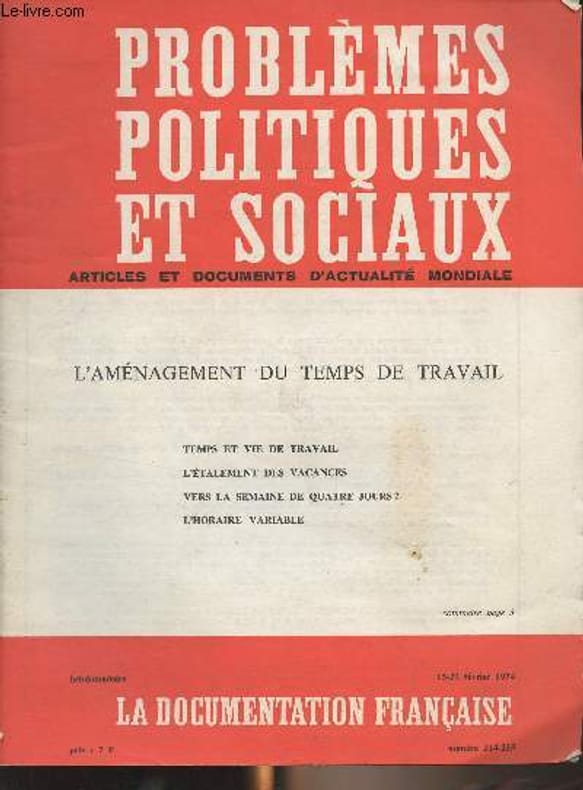 Sommaire : L'aménagement du temps de travail - Eliminer le compartimentage de la vie - Une vue prospective de l'aménagement du temps de travail - Le congé-éducation en URSS - Durée et fonctions principales du congé - Raccourcissement de la semaine de travail : Vers la semaine de quatre jours ? - La semaine de quatre jours soulève de nouveaux problèmes - L'horaire variable : Premiers essais - Principaux résultats des expériences étrangères - Le comité pour l'étude et l'aménagement des horaires de travail et des temps de loisirs dans la région parisienne.. Classification Dewey : 70.49-Presse illustrée, magazines, revues