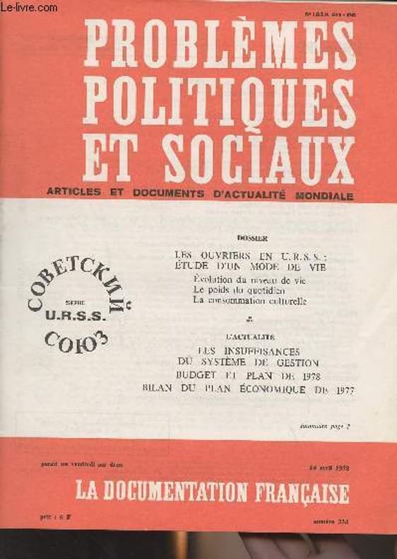 Sommaire : Dossier : Les ouvriers en URSS : étude d'un mode de vie - La place des ouvriers dans la société - Evolution du niveau de vie - Le poids du quotidien - La sociabilité et la politique en milieu ouvrier - Consommation culturelle - Aspects de l'actualité économique : Les insuffisances du système de gestion - Plan et budget - Bilan du plan de développement économique de l'URSS en 1977 .. Classification Dewey : 70.49-Presse illustrée, magazines, revues
