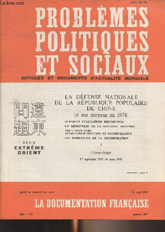 Sommaire : La défense nationale de la République populaire de Chine et ses moyens en 1978 - Quelques évaluations descriptives - La vie et l'entraînement du soldat - Un armement désuet - En Mongolie intérieure : une barrière contre les Soviétiques - L'état actuel des forces militaires - L'armée de l'air - La Marine - Un renouveau de la doctrine officielle : quelques textes importants - La menace principale vient de l'URSS - Accélérer la modernisation de la défense nationale - A propos de la guerre nucléaire et de la guerre populaire - Rapport sur les activités du gouvernement - Une réflexion de l'académie des sciences militaires - Révolutionnarisation et modernisation - Chou En-lai et l'A.P.L. - Etudier la science et la théorie militaires.. Classification Dewey : 70.49-Presse illustrée, magazines, revues