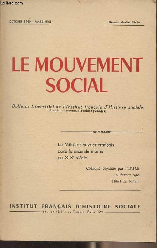 Sommaire : Le militant ouvrier français dans la seconde moitié du XIXe siècle - Colloque organisé par l'I.F.H.S. 14 février 1960 - Nouvelle étape - Ce colloque : un commencement - Etat des travaux universitaires inédits, faits depuis 1945 et concernant le mouvement ouvrier en France (1815-1939) - Le problème des sources dans l'étude du militant ouvrier - Les usines Cail et les ouvriers métallurgistes de Grenelle de 1848 à 1871 - Contribution au portrait du militant guesdiste dans les dix dernières années du XIXe siècle - La personnalité du militant ouvrier français dans la seconde moitié du XIXe siècle.. Classification Dewey : 70.49-Presse illustrée, magazines, revues