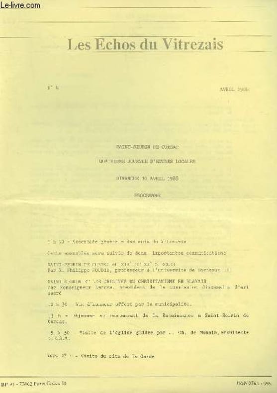 Sommaire : Saint-Seurin de Cursac, 4e journée d'études locales, dimanche 10 avril 1988 - Programme Classification Dewey : 70.49-Presse illustrée, magazines, revues