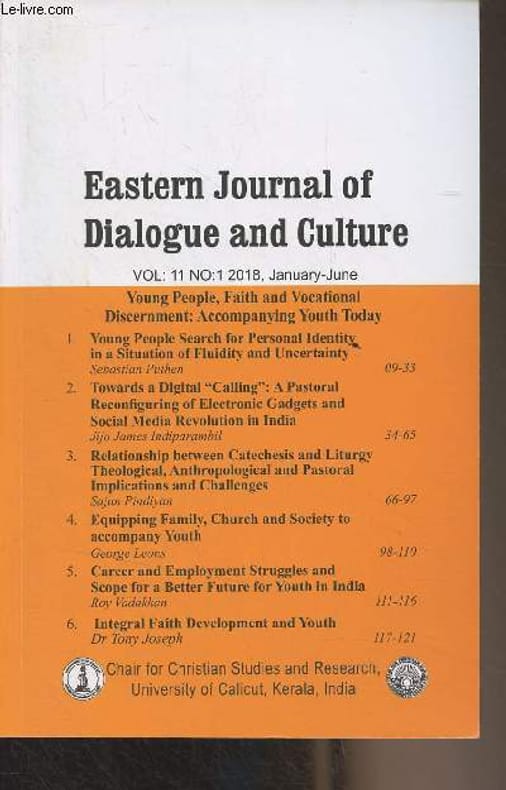 "Contents : Young People, Faith and Vocational Discernment : Accompanying Youth Today - Young People Search for Personal Identity in a Situation of Fluidity and Uncertainty - Towards a Digital ""Calling"" : A Pastoral Reconfiguring of Electronic Gadgets and Social Media Revolution in India - Relationship between Catechesis and Liturgy Theological, Anthropological and Pastoral Implications and Challenges - Equipping Family, Church and Society to accompany Youth - Career and Employment Struggles and Scope for a Better Future for Youth in India - Integral Faith Development and Youth.. Classification Dewey : 420-Langue anglaise. Anglo-saxon"