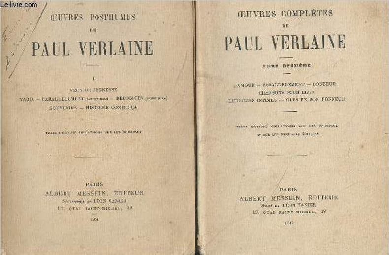 Albert Messein Editeur Broché "Trois volumes in-12 (13 x 18,7 cm), broché, les trois premiers tomes (sur 5) des ""Oeuvres complètes de Paul Verlaine"" éditées chez Albert Messein ; Tome 1 : Poèmes saturniens - Fêtes galantes - La Bonne Chanson - Romances sans paroles - Sagesse - Jadis et Naguère (ed. 1938, 409 pages) // Tome 2 : Amour - Parallèlement - Bonheur - Chansons pour elle - Liturgies intimes - Odes en son honneur (1926, 443 pages) // Tome 3 : Elégies - Dans les limbes - Dédicaces - Epigrammes - Chair - Invectives (1927, 422 pages) ; pliures au dos, dos du tome 1 fendu (mais la reliure tient), des rousseurs aux plats, par ailleurs assez bon état général. Livraison a domicile (La Poste) ou en Mondial Relay sur simple demande."