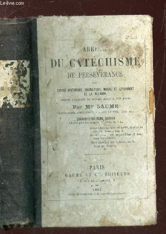GAUME ET CIE. 1887. In-16. Cartonné. Etat d'usage, Plats abîmés, Dos satisfaisant, Intérieur acceptable. 504 pages + 8 pages.. . . . Classification Dewey : 268-Catéchisme