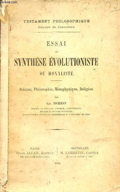 FELIX ALCAN / H.LAMERTIN. 1900. In-8. Broché. Etat d'usage, Couv. défraîchie, Dos abîmé, Quelques rousseurs. XVI + 476 pages - illustration en noir et blanc en frontispice - quelques rousseurs sans réelle conséquence sur la lecture - dos absent remplacé par du papier marron avec annotation du titre et de l'auteur au stylo noir - coiffes abîmées.. . . . Classification Dewey : 100-PHILOSOPHIE ET DISCIPLINES CONNEXES