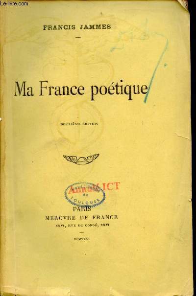 Mercure de France. 1926. In-12. Broché. Etat d'usage, Couv. légèrement passée, Dos satisfaisant, Papier jauni. 270 pages - tampons + annotation sur le 1er plat et sur la page de titre - étiquette collée sur la coiffe en pied.. . . . Classification Dewey : 841-Poésie