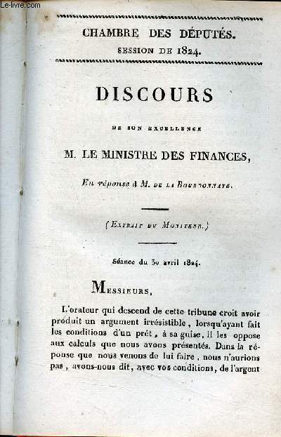 Hacquart imprimeur de la chambre des députés. 1824. In-12. En feuillets. Etat d'usage, Livré sans Couverture, Dos satisfaisant, Quelques rousseurs. 7 pages - livré sans couverture.. . . . Classification Dewey : 320-Science politique