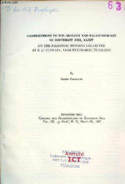 Geology and Palaeontology of Southeast Asia. 1967. In-8. Broché. Etat d'usage, Livré sans Couverture, Dos satisfaisant, Intérieur frais. Tiré à part paginé de 39 à 46 + 1 planche en noir et blanc - tampons + annotation sur la page de titre - tiré à part en anglais.. . . . Classification Dewey : 420-Langue anglaise. Anglo-saxon