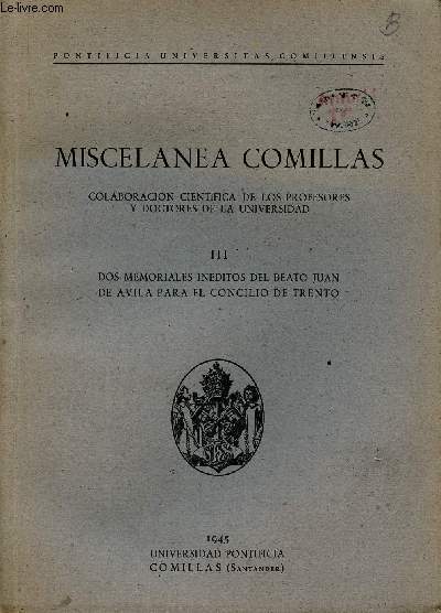 Universidad pontificia comillas - Ouvrage en espagnol - Sommaire : Miscelanea Comillas Presentacion - beato avila dos memoriales inéditos - memorial primero 1551 reformacion del estado eclesiastico - memorial segundo 1561 causas y remedios de la herejias - indice analitico - indice de las ideas mas importantes - citas de la sagrada escritura - citas de Santos Padres y Autores Eclesiasticos - una sola cita de autor profano etc. Classification Dewey : 460-Langues espagnole et portugaise