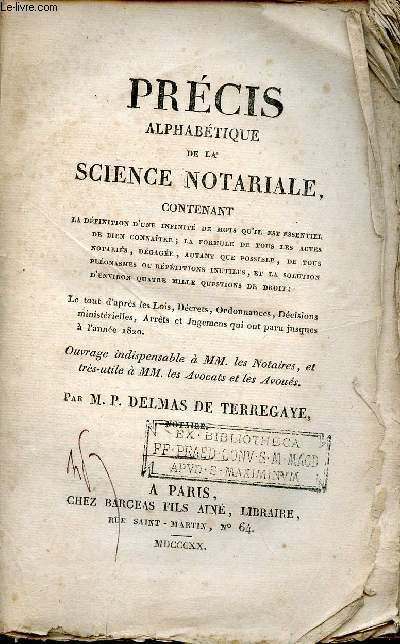Chez Bargeas Fils Ainé. 1820. In-8. Broché. Etat d'usage, Livré sans Couverture, Coiffe en pied abîmée, Quelques rousseurs. 517 + 24 pages - couverture muette - tampon + annotation sur la page de titre - pages non coupées - coiffes abîmées - quelques rousseurs à l'intérieur de l'ouvrage sans réelle conséquence sur la lecture.. . . . Classification Dewey : 340-Droit