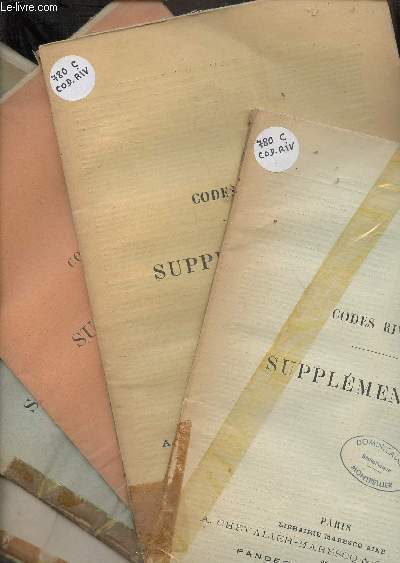A.Chevalier-Marescq & Cie. 1897-1903. In-4. Broché. Etat passable, Plats abîmés, Dos abîmé, Quelques rousseurs. Lot de 7 fascicules Codes Rivières suppléments 1897 à 1903 - Environ 50 pages pour chacun des fascicules - dos et plats abîmés - textes sur deux colonnes tampon + étiquette collée sur le 1er plat.. . . . Classification Dewey : 340-Droit