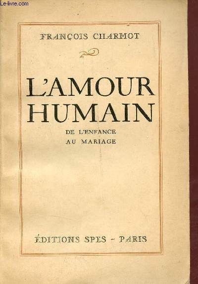 Spes. 1942. In-12. Broché. Etat d'usage, Tâchée, Coiffe en tête abîmée, Intérieur bon état. 316 pp., coiffe en tête abîmée, rousseurs sur le 1er plat. . . . Classification Dewey : 152.4-L'amour