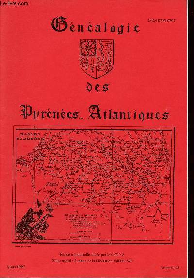 Sommaire : Listes Guy Bonnet Querlier et Vincent - instructions relatives aux noms à donner aux enfants toruvés 1812 - Bernadotte René Agathocle 1860-1914 - gens du Comminges et Pays voisins partis à Bayonne et au Pays Basque (suite) - inventaire des bien de Jean vicomte d'Urtubie - cycle des conférences du cgpa en 1997 . Classification Dewey : 929-Généalogie