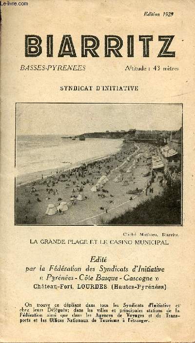 Fédération des Syndicats d'Initiative. 1929. In-Plano. En feuillets. Etat d'usage, Couv. convenable, Dos satisfaisant, Papier jauni. Une plaquette dépliante de 12 pages.. . . . Classification Dewey : 908.447-Régionalisme : Aquitaine