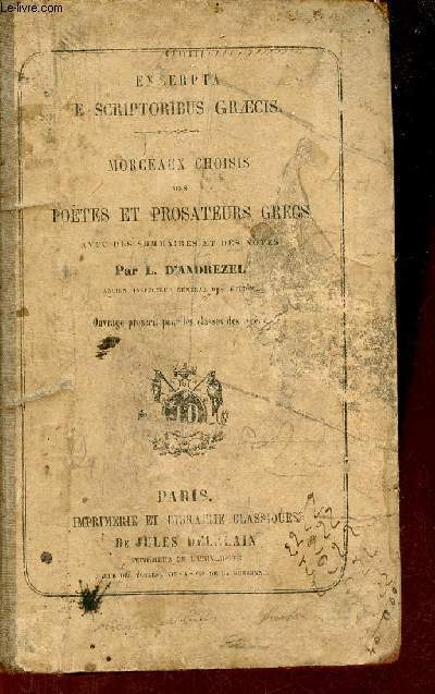 Jules Delalain. 1861. In-12. Cartonné. Etat passable, Couv. défraîchie, Dos satisfaisant, Quelques rousseurs. 228 + 168 pages - ouvrage en grec avec des notes en français - rousseurs à l'intérieur de l'ouvrage sans réelle conséquence sur la lecture - annotations, tâches sur les plats - quelques annotations à l'intérieur de l'ouvrage sans réelle conséquence sur la lecture.. . . . Classification Dewey : 880-Littératures helléniques. Littérature grecque