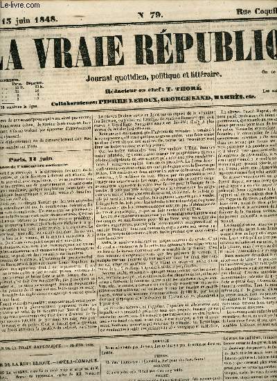 Rédacteur en chef T.Thoré - Sommaire : Paris 12 juin séance de l'assemblée nationale - théatre de la république opéra comique les frais de la guerre comédie en trois actes et en prose de Léon Guillard réprise de Fiorella opéra de Scribe et Auber - nouvelles des départemens - nouvelles étrangères Allemagne, Prusse, Autriche - assemblée nationale présidence du citoyen senard séance du 12 juin - correspondance - faits divers. Classification Dewey : 70.1-Journaux