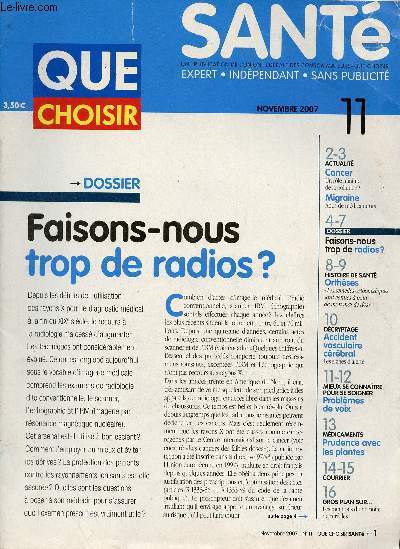 Sommaire : Cancer un rôle minime de la pollution ? - migraine abus de médicaments - faisons nous trop de radios ? - orthèses les semmes orthopédiques sont venues à bout de mon mal de dos - accident vasculaire cérébral les signes d'alerte - problèmes de voix - médicaments prudence avec les plantes - les mentions d'une boîte de céréales. Classification Dewey : 70.49-Presse illustrée, magazines, revues