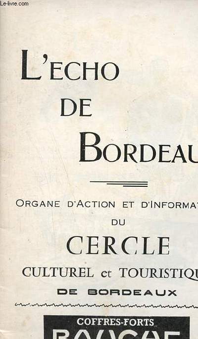 Sommaire : Un anniversaire - nos buts, notre action - l'Europe en marche - cercle culturel et touristique de Bordeaux - de Soulac à Saragosse ou de quelques mois d'activités - réception d'une délégation du cercle au palais Rohan - la journée culturelle d'amitié franco grecque - réception d'une délégation du cercle en Andorre - amicale journée franco canadienne . Classification Dewey : 908.447-Régionalisme : Aquitaine