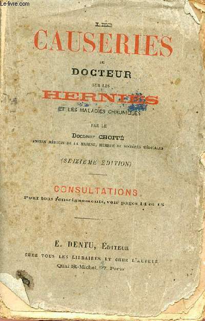 E.Dentu. non daté. In-12. Broché. Etat passable, Plats abîmés, Dos abîmé, Quelques rousseurs. 354 pages - papier jauni - plats désolidarisés - déchirures, tâches et manque sur les plats - dos absent - portrait en noir et blanc en frontispice.. . . . Classification Dewey : 610-Sciences médicales. Médecine