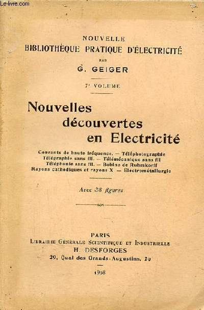Courants de haute fréquence - téléphotographie - télégraphie sans fil - télémécanique sans fil - téléphonie sans fil - bobine de Ruhmkorff - rayons cathodiques et rayons x - electrométallurgie. Classification Dewey : 537-Electricité