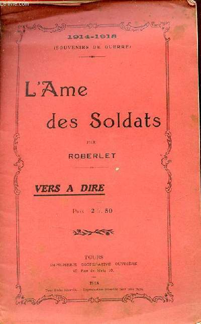 Imprimerie coopérative ouvrière. 1918. In-8. Broché. Etat d'usage, Couv. légèrement passée, Agrafes rouillées, Papier jauni. 22 pages agrafées - bandeaux et culs de lampe en noir et blanc - rousseurs sur les plats.. . . . Classification Dewey : 940.3-Première Guerre mondiale 1914-1918