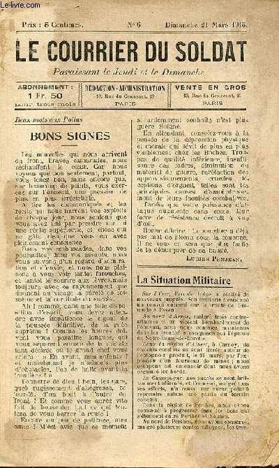 Deux mots aux poilus bons signes - la situation militaire - avis à nos lecteurs - échos de la guerre - la France au Rhin - correspondance - petites recettes du soldat. Classification Dewey : 940.3-Première Guerre mondiale 1914-1918