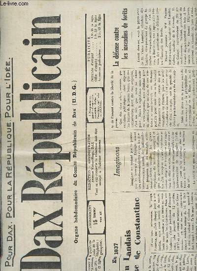 Sommaire : Un landais à la prise de Constantine - différence - M.Blum et la liberté de la presse - la défense contre les incendies de forêts - conseil municipal de dax - autour de la coopérative de blé des landes - conséquences de l'asthme - la commémoration de la victoire à Dax - purges d'hypothèques légales - du plaisir de donner et des dons qui font plaisir. Classification Dewey : 70.1-Journaux