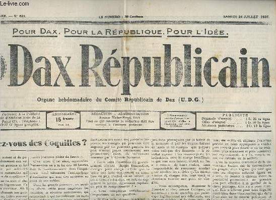 Sommaire : En voulez-vous des coquilles ? - un discours de M.le sénateur Victor Lourties - faire payer ! - à propos de la hausse des prix - conseil municipal de dax séance du 26 juin 1937 - le Général Henry Seron - train spécial d'exposition - une belle audition artistique - la fête scolaire de ce soir - illumination de la Fontaine-Chaude - amicale des anciens élèves de l'eps - un traitement efficace - grande nocturne cycliste au vélodrome Maurice Boyau - purge légale - à l'école maternelle - marché du 24 juillet - banque populaire des Landes et du Pays Basque réunis. Classification Dewey : 70.1-Journaux