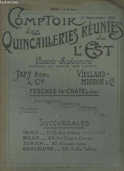 Imp.Waton. 1925. In-4. Broché. Etat d'usage, Tâchée, Dos abîmé, Papier jauni. Catalogue de 88 pages agrafées - nombreuses illustrations en noir et blanc dans le texte - agrafes rouillées - mouillures sur les plats.. . . . Classification Dewey : 56-Catalogue