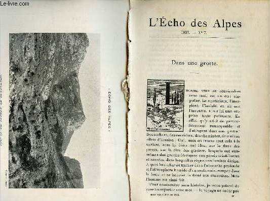 L'écho des Alpes. 1913. In-8. Broché. Etat d'usage, Livré sans Couverture, Dos abîmé, Intérieur acceptable. Paginé de 253 à 300 - livré sans couverture - dos absent - quelques dessins en noir et blanc dans le texte - 2 planches en noir et blanc.. . . . Classification Dewey : 70.49-Presse illustrée, magazines, revues