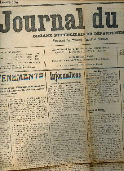 Journal du Lot. 1939. In-Plano. En feuillets. Etat d'usage, Couv. convenable, Dos satisfaisant, Papier jauni. 4 pages.. . . . Classification Dewey : 70.1-Journaux