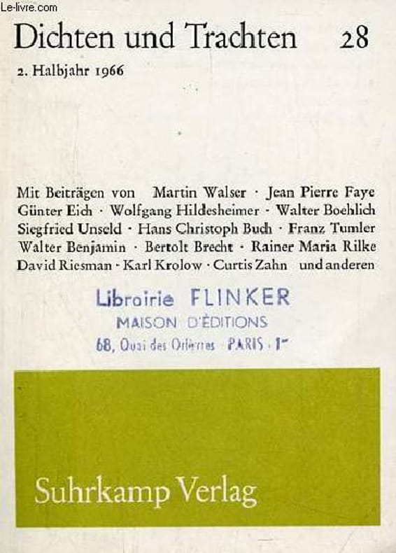Suhrkamp Verlag Frankfurt am Main. 1966. In-16. Broché. Bon état, Couv. convenable, Dos satisfaisant, Intérieur frais. 128 pages - ouvrage en allemand - quelques planches en noir et blanc - tampon sur le 1er plat.. . . . Classification Dewey : 430-Langues germaniques. Allemand