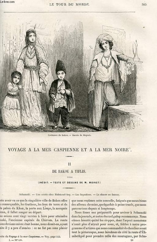 Costume de Bakou - dessin de Moynet, Carte des pays voisin du caucase par A. Vuillenun, Vue Générale de Schamaki - dessin de Moynet, Une soirée chez un riche Tatar, à Schamaki - dessin de Beaucé, Porte d'une maison lesghienne - dessin de Moynet, la Vallée de Noukha - dessin de Moynet, Chateau de la reine Thamara - dessin de Moynet, De TIFLIS a la mer noire - VUE de TIFLIS - dessin d eThérond, Costumes georgiens - dessin de Moynet, Le Chateau de Gori - dessin de Francais, Sommet du mont Sourham - dessin de Moynet, Une vue du mont Sourham - dessin de Moynet, Les bords du Phases - dessin de Moynet, L'embouchure du Phases à Poti, prés de la mer Noire - dessin de Moynet Classification Dewey : 70.4412-Le journal des voyages