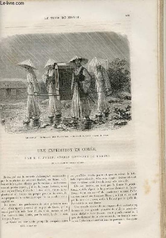 Carte de Corée en pleine page,dressée par H. Zuber d'après une carte indigène et les cartes du Dépôt de la Marine. Mandarins, archers, gravures dans le texte. Gravures pleine page d'une vue de Kang-Hoa et du Yamoun du gouverneur à Kang-Hoa. Classification Dewey : 70.4412-Le journal des voyages
