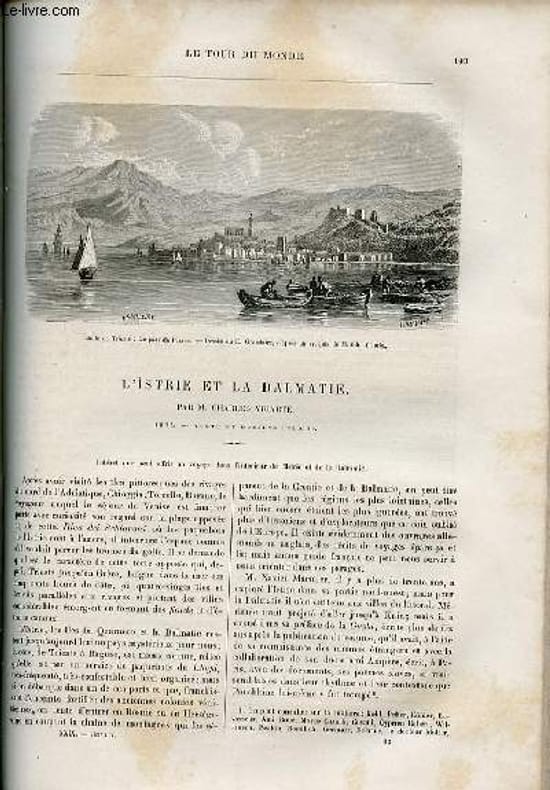 Trieste-les Cici, illustré d'une carte hors texte de l'Istrie, îles Dalmates, dalmatie et Montenegro, et de gravures dont une en pleine page des envirosn de Trieste: château de Miramar,résidence de l'archiduc Maximilien. La tribu des Cici,origines et moeurs, industrie - villages Cici,illustré de gravures dans le texte. Gravure pleine page du cabinet de travail de l'archiduc Maximilien à Miramar.Les anciennes salines détruites par les Vénitiens-Muggia-port de Pirano. Géogrpahie de l'Istrie-ses divisions-les côtes-population,races diverses et moeurs,illustré d'une gravure: vue de la ville de Pisino au bord d ela Foiba. Pisino-les costumes slaves,illustré de gravures dans le texte: paysans (fermière de Dignano,habitant de Monpaderno), le Duomo de parenzo, église des premiers temps du Christianisme. La Foiba. Antgnana-Sbandati. parenzo-île de san Nicolo. De Parenzo à Pola par mer-Rovigno-Fasana-Santa Catarina in Scoglio-canal de Fasana. Pola,place du forum,palais municipal-temples de Diane-temple de Rome et d'Auguste,illustré d'une gravure des monumens antiques à Pola: l'amphithéâtre romain. La porte d'Hercule-POrta Gemina-porta Aurata. Classification Dewey : 70.4412-Le journal des voyages