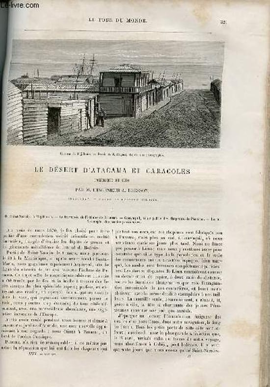 De Saint Nazaire à Mejillones-traversée de l'isthme de Panama-Guyaquil,vraie aptrie de schapeaux de Panama-Lima,triomphe des modes parisiennes,illustré d'une carte dans le texte de la Bolivie,de gravures dont Cobija,. La péninsule des guaneras-de Méjillones à valparaiso-paposo-changos-balsas-le coca-Atacamenos-Aymaras-montera et topo. La Caldera-la découverte de don Jose Diaz Gana-les cateadores,illustré d'une gravure d'une vue générale de Méjillones. Aspect général du désert d'Atacama-la Cordillère-Rio Loa, seul cours d'eau- Calama-capitale Atacama-apechacas. Conseil dangereux d'un cateador-les condors-les cavaliers, illustré d'une carte dans le texte (typographique et minéralogique) du désert d'Atacama. Excursion dans la Cordillère-cholos-ballet dans une pulperia-la chicha. District de Caracolès-histoire de la Placilla-gisements argentifères,illustré d'une gravure d ela vallée des Cordillères, d ela Placilla en 1873. La locomotive Fairlie-ressources de la Bolivie,illustré d'une gravure dans le texte de la locomotive du désert et une autre d'un cactus du désert. Classification Dewey : 70.4412-Le journal des voyages
