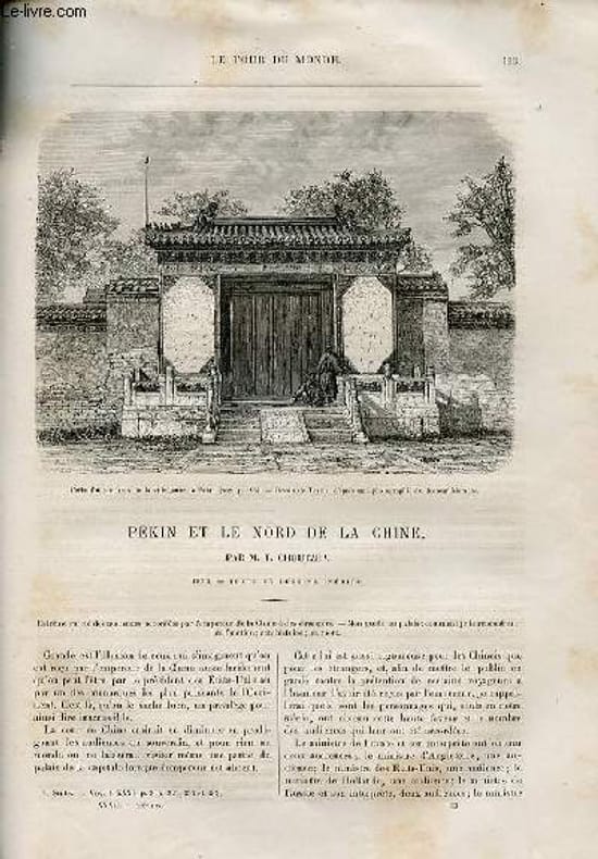 extrême rareté des audiences accordées par l'empereur de la Chine à des étrangers-mon guide au palais. La Porte de la Grande Pureté-les ponts de l'Onde d'Or-les Portes de la Tranquilité céleste et du Principe-le temple des Ancêtres-le temple de Che et Tsi-le pavillon de la Splendeur Empourprée-pavillon de la Souveraine Concorde-la mosquée des musulmans à bonnet rouge,illustré d'une gravure du Pont des Mendiants dans la ville chinoise. Palais de la Concorde Moyenne et de la Concorde Protectrice-la Porte Fleurie-le Tchouane sine Tiène,illustré d'une gravure des lacs et jardins du palais impérial,nombreuses gravures dans le texte de marchands. L'empereur régnat (enfance,adolescence)-un décret des deux impératrices-la fiancée de l'empereur,illustré d'une gravure de Ouane-cheou-chane, d'une gravure du pont de marbre de 17 arches conduisant à l'île dans le lac Ouane-cheou-chane, le temple de bronze sur le versant sud de Ouane tcheou chane et la pagode indienne au sommet de Ouane Tcheou Chane (Yuen-min-yuen). la pagode des menuisiers-le bouddhisme,illustré d'une gravure de la tour funéraire à la mémoire d'un bonze. La cusine en Chine-mets les plus demandés à Pékin,illustré d'une gravure :partie d'habitation d'une famille aisée. Gravures pleine page de 3 vases de pocelaine dynatie des Mings et 3 autres vases de porcelaine de la dynastie des Tsings. La rue du Boeuf-l'islamisme à Pékin-Yang et sa maison rue de la Pie. Le théâtre chinois à Pékin-la troupe de Cane-sa-eurl, illustré d'une gravure représentant des tragédiens pékinois, d'une autre gravure représentant l'autel du temple du Ciel. Les religions de la chine - philosophie de Conficius-Laotzé, illustré de gravures: un Sthoupa indien ou monument élevé à la mémoire du premier grand lama venu à Pékin, bonzes (prêtre bouddhistes) du culte indien. Classification Dewey : 70.4412-Le journal des voyages