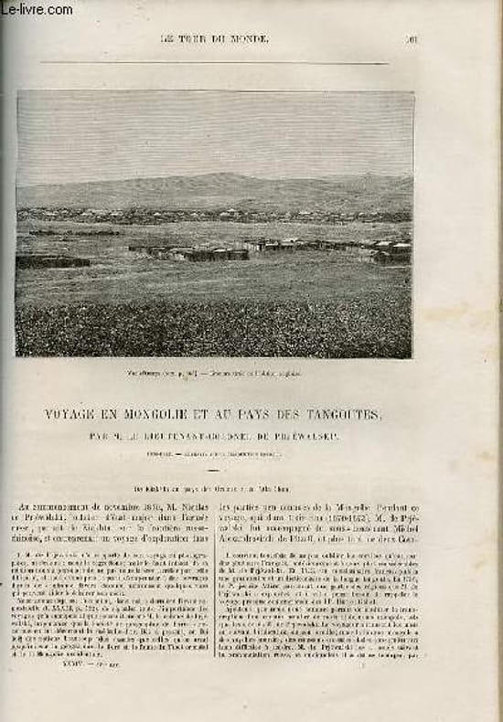De Kiakhta au pays des Ordous et à l'Ala Chan,illustré d'une carte pleine page de la Mongoli, turkestan oriental, thibet, d'une gravure dans le texte d'une voiture chinoise, d'un houtouktou ( eccésistique d'un ordre supérieur), autre gravure dnas le ttexte d'un syrrhaptes Paradoxus. Gravures pleine page du lieutenant colonel de Prjéwalski par Barbant et Lix, de cosaques de l'expédition. Din - iouan - in - l'amban et sa famille - Kalgan - excursion à Pékin - chaine du Mouni Oula - départ pour le lac Koukou Nor - les daltis - le temple de Tcheibsen - le yak - l'argali - légende du Koukou - nOr, illustré dans el texte de gravures d'argali, d'un lama recouvert de ses habits sacerdotaux, de gravures pleine page : cavaliers et fantassin mongols, insurgés mahométans, chapelle bouddhiste. La chasse au djan (âne sauvage) - brigandages de s Tangoutes - massifs du Bourhan Boudda et du Chouga - Riche Montagne Noire - plaine de Galbin-Gobi - Ourga,illustré de gravures dont en pleine page: chasse aux yaks sauvages, Tchoutoun Dzamba, le retour du cosaque. Classification Dewey : 70.4412-Le journal des voyages