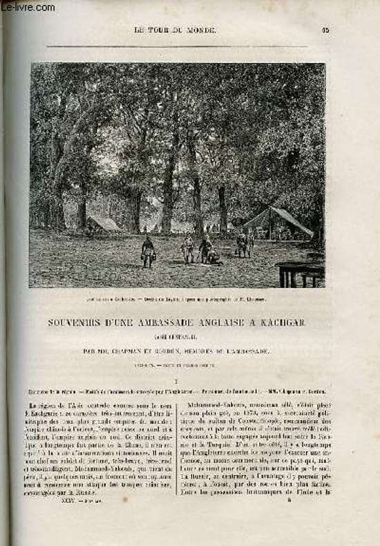 Chapman et Gordon. départ de Cachemire--adieux au maharajah-serviteurs de Chapman-les deos bouddhiques,illustré d'un plan:carte du Turkestan oriental. Lama-Zuru-choctens-Kulsi-Mimmoo. Arrivée à Leh-le monastère d'Hémis-les femmes du rajah du Ladak,illustré d'une gravure pleine page du monastère de Lama-Zuru,d'une autre gravure du monastère bouddhiste d'Hémis,près de Leh. panamick-passage du col de Kardhung-les yacks remplacent les poneys-passage de la rivière Shayok-arrivée de Mulla Artuk-passage du col de Sasser-le Karakoroum et le Suget sont heureusement franchis,illustré de grvaures dont le passage du Shayok. Arrivée à Shahidulla - réception par les autorités de Yarkand-itinéraire du capitaine Biddulph-la province de Khoten,illustré d'une gravure du passage du col de Sanju. Kargalik-le faisan shaw-le fort d'Abou-Bekr-paysages kirghises,illustré de gravures dont une d'une visite au Dadkwah de Yarkandyarkand, illustré d'une gravure d'une rue de Yarkand. La vallée de Yarkand-vue du Pamir-Koh-robât - les ourda de l'atalik-Kisil-vallée délicieuse du Yangi-Hissar,illustré de gravures dont une des ruines de l'ancienne ville de Kachgar. L'armée d el'émir de Kachgarie-les Taifourchis,illustré d'une gravure d'exercices des taifourchis. gravure pleine page d'une vue générale du mausolée du sultan Satouk-Borga-Khan. Le poste avancé de Karawal- les tentes des kirghises-le Tangitar-Tigarmatti-retour à Kachgar,illustré de gravures dont une de l'avant-poste de Karawal, un campement de Kirghises dans la vallée de Tigarmatti. départ de Yangi-Hissar-col de Kaskasou et de Torut- vallée de Sirikol-fort de Tachkourgan,illustré de gravures dont la chaine du Pamir,vue de Yangi-Hissar. Kila-Panja-le mir Futteh Ali Chah. Classification Dewey : 70.4412-Le journal des voyages