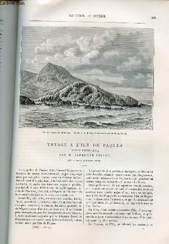 Nombreuses gravures dans le texte: l'île de Paques vue de la mer,muraille avec tumulus, tumulus de la baie de la Pérouse,ruine d'une allée pavée,statue à Ronororaka,ruines du Pakoapa d'Opulu et sa restauration, carte de l'île de Pâques avec itinéraire de pinart et des officiers du Seignelay,bois parlant (document fourni par Pinart) . Gravures pleine page: cratère de Ronororaka,campement sur le ronororaka,réception de Pinart par la reine de l'île de Pâques. Classification Dewey : 70.4412-Le journal des voyages
