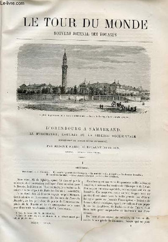 Orenbourg,illustré de gravures:Orenbourg,un molah (dans le texte). D'Orenbourg à Kazalinsk. De Kazalinsk à Turkestan,illustré de gravures: kirghises pauvres et riches;Kibitkas kirghises dans la steppe. De Turkestan à Tachkend,illustré de gravures dans le texte et d'une carte allant de St Petersbourg à Samarkand en hors texte. De Tachkend à Samarkand,illustré de gravures dont: médresse de Tilla-Kari,mosquée de Chir-Dar,mosquée d'Ouloug-Beg,plan hors texte de la ville de Samarkand;bazar de Samarkand,la place Bibi-Khanym,une vue générale de la mosquée du Schah Sindeh,carte hors texte de la région du Haut Oxus et du Haut Iaxarte. Khokand,illustré de gravures dont : place du marché à fourrages à Khokand,vue du palais de Khokand,cour intérieure du palais de Khokand,mosquée de Hazret à Turkestan (vue du côté gauche),tombeau d'Ali à Schakhimardân,la nouvelle mosquée à Och, femmes tadjique et sarte,pavillon d'été dans le parc du château d'Andidjan,type de vieille mosquée en Asie Centrale,intérieur d'une mosquée près de Bokhara. Classification Dewey : 70.4412-Le journal des voyages