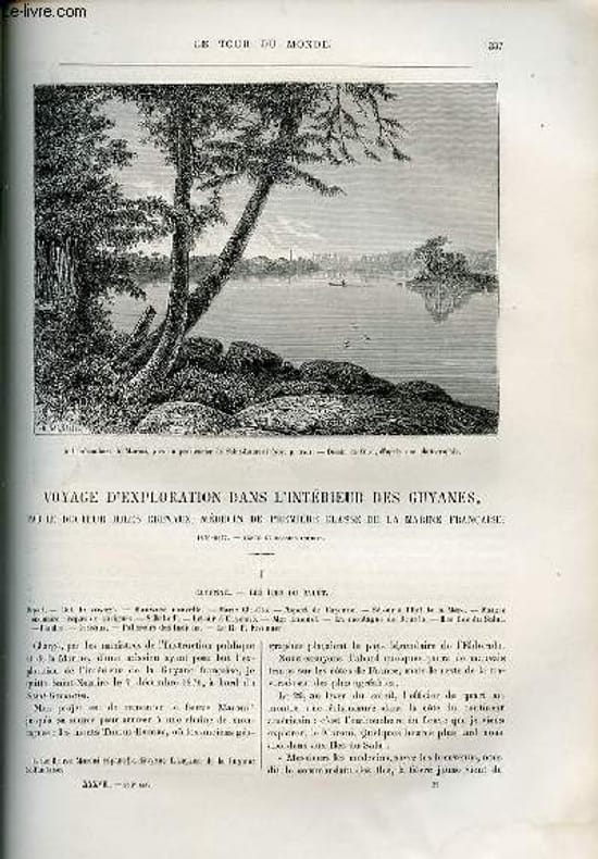 Cayenne - les îles du Salut,illustré de gravures dans le texte (dontdeux oiseaux: paille-en-queue ou phaéton et frégates. De Cayenne à Cotica, illustré d'une gravure du chalet du gouverneur à la montagne de Bourda,d'une carte hors texte de la Guyane française et du cours du Yari,gravures: indiens Galibis fabricant des poteries,rapides de la Guyane,les grnads bois de la Guyane. Le Grand-Man consulte le ciel-Saba malade-tribu des Bonis-guerre des Bonis avec les Oyampis-guerre avec les Oyacoulets,illustré de gravures dont :village d'indiens Bonis,indiens Bonis,,pêche au coumarou. Les singes-un duo par un seul singe hurleur-oiseaux (hoco,maraille,agami)-Sauriens-serpents-les danses-le mariage-les funérailles-le langage,illustré de gravures dont l'enterrement des cheveux et des ongles d'un Grand-man et de sa femme chez les Bonis; le calendrier des Bosch, les traductions des jours de la semaine, des mois et des nombres, quelques noms de femmes et d'hommes et nombreux substantifs,verbes et adjectifs. De Catica au pied des monts Tumuc-Humac,illustré de gravures dont le docteur Crevaux et Sababodi ; iguanes par Valette (dans le texte), arrivée chez les Roucouyennes,passage sur des troncs d'arbres. a travers les Tumuc-Humac,illustré de gravures des montagnes Tumuc Humac. La crique Carapi - le saut de Caramaraka - danse des Indiens du Yari - la crique Ouapoupan,illustré de gravures : saut de l'Apaouani,danse des Roucouyennes. Etude sur les indiens des Guyanes - le Yari - les roches du Mauvais Esprit - la crique Kou - chute de la Pancada - vaillance d'Apatou - chute de la Pacanda,illustré de gravures: indiens Roucouyennes, coiffures et bijoux Roucouyennes (dans le texte), crémation d'un Roucouyenne, chute du Yari. Classification Dewey : 70.4412-Le journal des voyages