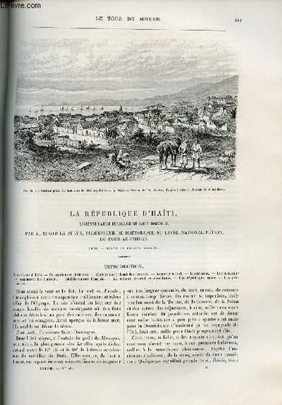 Noms divers d' Haïti - aspect général - l'intérieur - les Africains y remplacent les Indiens - premier aspect du Cap haïtien - second aspect - Milot et Sans Souci - la citadelle Laferrière - le Palais du ramier - bouvier courtisan de ce qui lui advint avec gravures dans le texte (casernes du cap François au temps de la possession française, ruines de l'église Saint Pierre et SAint Paul cathédrâle du Cap au temps de cette possession) et gravure pleine page d'une vue générale du cap Haïtien. Autres gravures dans le texte: le morne du Bonnet à l'Evêque et le palais de Sans SOuci à Milot avant la mort de H. Christophe ; ruines intérieures. Gravures pleine page: ruines du palais de Sans SOuci à Milot, la citadelle Laferrière vue prise des Mornes. Courouille - le Limbé - Clameille - Le Dondon - paysage - la Voute à MInguet - nuit splendide illustré de gravures dans le texte. La Conception - Baie de l'Acul - l'Acul Du nord - le Port MArgot - Jean rabel , le Port à Piment illustré de gravures dans le texte et d'une carte dans le texte de l'île d'Haïti , d'une gravure pleine page de l'île de la Tortue (vue de l'embouchure des Trois Rivières). Petite rivière de l'Artibonite - la Crête de Pierrot - Guiambois - lully - Blanc Cassenave - la maison Saint Macary illustré d'une gravure pleine page de al Plate Forme et de gravures dans le texte (fort de la Crête à Pierrot, ruines de la maison Saint macary). La capitale - le tremblement de terre de 1770 - Pétion enfant échappe à la mort - le Port au Prince devint la ville de feu - le comte Emmanuel de lémont - Martissant - le docteur J.B. Dehoux et l'Ecole de médecine illustré de gravures dans le texte (habitation de plaisance au Port au Prince, la Banque nationale d'Haïti,ruines du palais national incendié par le président à Salnave en 1868, le petit Séminaire collège Saint MArtial). Autre gravure pleine page du Pont Rouge près de Port au Prince. Le retour du président - un arc de triomphe de l'Etoile - le Vaudoux - Petionville illustré d'une gravure pleine page de Nissage Saget (8ème président de la république d'Haïti) et autre gravure pleine page d'Haïtiennes du High-life. Mlle Choune - le fort Ca-Ira - Joseph Lacombe - Ignace Nau - Marie CLaire Heureuse - catholicisme et maçonnerie mêlés illustré de gravures dans le texte (déjeuner chez Mlle Choune,ruines du fort Ca-ira et maison de Mlle Choune, le général Tibérius Zamor, le général Gracchus Petit, le fils du commandant Rosier By et gravure pleine page d'une vue de la ville du Petit Goave au temps de la possession française. Miragoâne - Nippes - l'Anse-à-Veau - les 2 Caïmites - Pestel - le Petit Trou des Roseaux - Jérémie - Guinaudraie - le fort Mafranc illustré de gravures dans le texte et d'une gravure pleine page d'une vue du bourg du cap Tiburon au temps de la possession françaiseTrou BOnbon - l'Anse du Clerc - les Abricots - le paradis indien - Petite Rivière de Dalmarie - Port à Piment - les Coteaux - Port Salut - Ile à Vaches - la Folle - Torbeck - labaie des Cayes illustré de gravures dans le texte et d'une gravure pleine page de la ravine du sud. Classification Dewey : 70.4412-Le journal des voyages