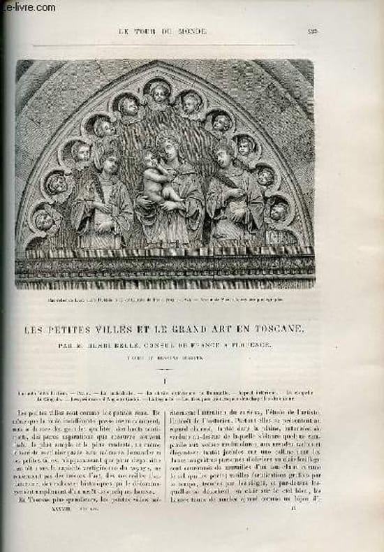 Prato - la cathédrâle - la chaire extérieure de Donatello - aspect intérieur - la chapelle du Cingolo - les peintures d'Angiolo Gaddi - la légende - les fresques giottesques des chapelles du coeur illustré de gravures dans le texte (bas relief de Luca della Robbia à la cathédrâle ,portes latérales de la cathédrâle du Prato, la chaire extérieure). Les fresques de Filippo Lippi - aventurs du vieux peintre - couvents des femmes au Moyen Age - bibliothèque Ronciana illustré d'une gravure pleine page d'une chaire intérieure de la cathédrpale de Prato par Rosselini et Mino de Fiesole et d'une gravure dans le texte. Déboisements et inondations - Pistoia - Blancs et Noirs - la cathédrâle - la chaire de Groppolo - la chaire de San Bartolomeo illustré d'une gravure pleine page de la place de la Cathédrâle à Pistoia et autre gravure pleine page de la chaire de San Bartolomeo et de gravures dans le texte. La chaire de San Giovanni Fuorcivitas illustré de gravures dans le texte (église de San Giovanni Fuorcivitas à Pistoia,détails de cette chaire), d'une gravure pleine page de la chaire de l'église de San Giovanni. La chaire de San Andreas illustré d'une gravure dans le texte de détails de cette chaire et d'une gravure pleine page d'un bas-relief de la chaire de San Andreas à Pistoia (le massacre des Innocents). Les églises de Pistoia - les Grecs en italie - les sculptures au 12ème siècle illustré d'une gravure pleine page d'une chaire hexagone de San Andrea à Pistoia et de gravures dans le texte. Les vieux palais - les Vergiolesi - messer cino et la belle Selvaggia avec gravure dans le texte de la statue de Saint Michel dans l'église de Groppolo. Le palais communal - un tableau par Poussin illustré de gravures dans le texte (palais communal à Pistoia,bas relief d'Andrea della Robbia: la Visitation et autres bas-reliefs), d'une gravure pleine page de la façade de l'hôpital del Ceppo à Pistoia, trois fois deux autres gravures hors texte sur une page représentant des bas-relief à l'hôpital de Ceppo. Serravalle - Pescia avec gravure dans le texte. Classification Dewey : 70.4412-Le journal des voyages