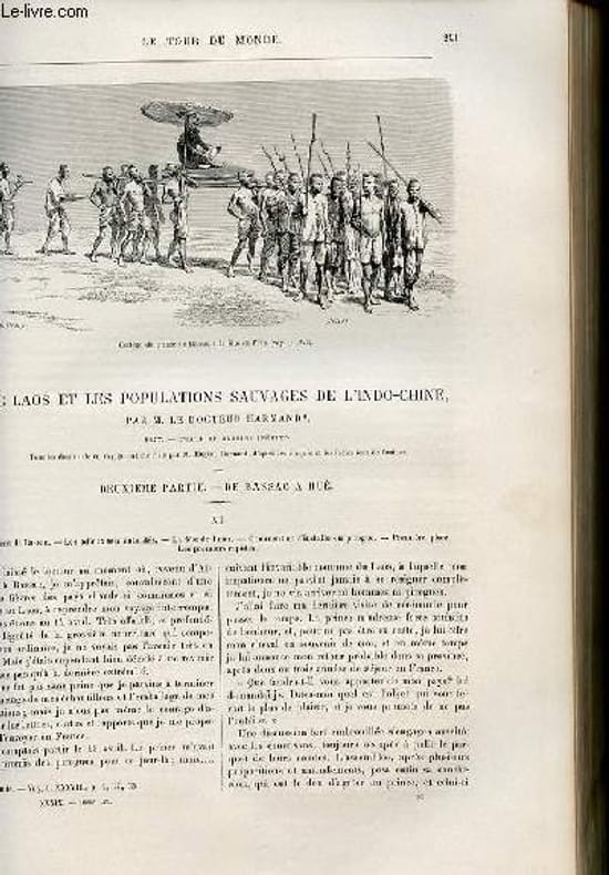 Départ de Bassac - les adieux aux autorités - la fête de l'eau - les premiers rapides illustré de gravures dans le texte (cortège du prince de Bassac à la fête de l'eau, le Mê-không entre Pak-moun et Kemmerât) et gravures pleine page (camp de pêcheurs laotiens dans les roches du Mé-không, passage du rapide de Kheng Dôn Saâ, les jabirus sur les bancs de sable du Grand Fleuve). La-Khôn - La colonie annamite - les montagnes - la défiance des autorités laotiennes avec gravures dans le texte (arrivée devant le village,campement sous les bambous) , carte pleine page des itinéraires entre Bassac La-Khon et Hué (février-août 1877). la saison des pluies au pied des montagnes - les cavernes - adieu au Nam-không - départ de La-Khôn - le meuong Phou-Wà - discussions avec les mandarins illustré de gravures dans le texte (roches de marbre noir des montagnes,départ de la Khôn) et de gravures pleine page (chasse aux chauves-souris dans les cavernes. Départ pour Nam-Nau - Les sauvages Souës et Phelong illustré de gravures dans le texte et de gravures hors texte (colonne de porteurs au travers des rizières,nuit de misère). Les pagodes de la rive gauche du Grand Fleuve - Phalàan - en route pour le Sé-bang Hieng avec gravures dans le texte dont types de sauvages. De Phông au Sé bang-Hieng - gouverneur de Son Khôn - nouvelles tentatives avec gravure dans le texte et une hors texte du châtiment d'un mandarin dans la pagode de SOng Khôn. Fac similé dans le texte d'un croquis du Sé bang Hieng. Exploration du Sé Bang-Hieng - passage des rapides - rencontre d'éléphants sauvages avec gravures dans le texte et une hors texte. Le Sé bang-Hieng au dessus des rapides - les khâs Themep avec gravures dans le texte odnt une flute khâ, un instrument de culture khâ et une carte dans le texte de la reconnaissance du Sé bang-Hieng et itinéraire dans les provinces de Phong et de Song Khôn. Classification Dewey : 70.4412-Le journal des voyages