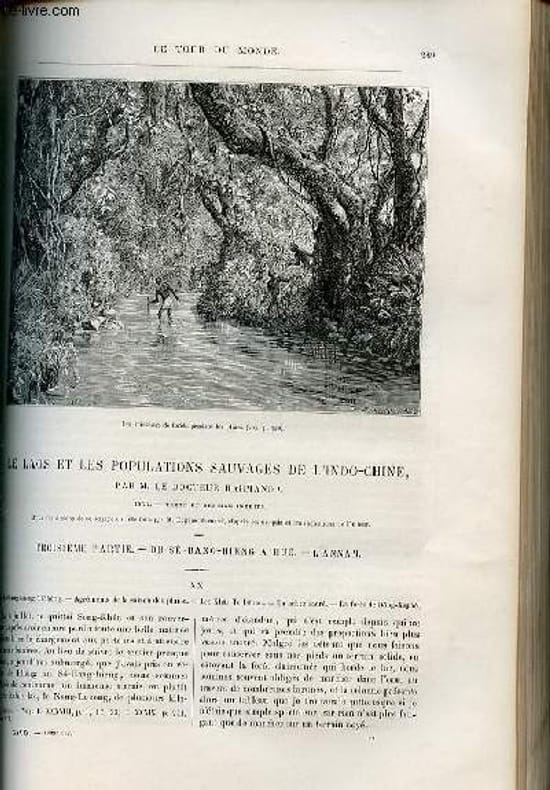 Du Sé bang Hieng à Phông - agréments de la saison des pluies - les Khâs Te Dôuon - arbre sacré - la forêt de Dong-Kepho illustré de gravures dans le texte dont les excavations de Dông Kephô et le plan d'une case de Khâs Douôns et d'une gravure pleine page d'un arbre fétiche. Les Meuong-Phin - les Pou-Thays et les provinces tributaires de l'Annam - ruse d'Annamite avec gravure dans le texte de Khâs Douôns en prière et gravure pleine page par Burnand du passage du Sé-Touon. En route à travers les fondrières - le cours du Sé-Tchepôn et ses rapides - arrivée au premier fort annamite avec carte dans le texte de la reconnaissance du Sé Tchepôn ou Sang na Bon et gravure dans le texte de la rivière sous bois. Classification Dewey : 70.4412-Le journal des voyages