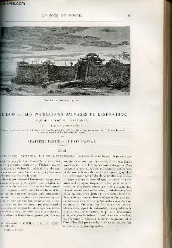 Influence de l'esclavage - séjour à Dinh - déportation chez les Annamites - le premier huyen illustré de gravures dans le texte: vue du fort de Cam-Lô,pipes de sauvages indochinois, carquois de Stiengs et détails de ce carquois. Politique annamite - à l'aventure - hospitalité des Moïs - traversée de la grande chaine - Cam lô avec deux gravures dans le texte : façade de la maison d'un riche annamite,visite du mandarin de Cam Lô et gravure pleine page d'un courrier de la poste (tram). Les Chrétiens annamites - la grand'route du Tong-King - le fort de Quang - Tri - la mission de Bo-Liéou - arrivée à Hué avec gravures pleine page dont un bac de la province de Hué, autres gravures dans le texte dont le docteur Mondière. Classification Dewey : 70.4412-Le journal des voyages