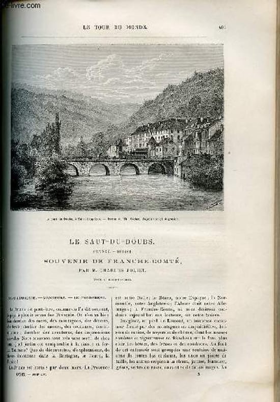Saint Hippolyte - Mandeure - le Fondereau illustré d'une gravure dans le texte: le pont du Doubs à Sainte Hippolyte et d'une gravure pleine page de Saint Hippolyte. La vallée d'or - le château de la Roche - Roche d'Or avec gravure dans le texte de la vallée d'or. La vallée du Dessoubre - sa source - le Doubs - Neuchâtel - le Saut Du Doubs avec gravure dans le texte du chemin du Moulin de la Mort, autre gravure dans le texte des sources du Lison et gravure pleine page du cours du Doubs ; autre gravure dans le texte du col des Roches (tunnel des Brenets). Le Saut Du Doubs avec gravures dans le texte (bassin du Saut du Doubs et usine près du saut du Doubs) et gravure pleine page du Saut Du Doubs (cascade). Classification Dewey : 70.4412-Le journal des voyages